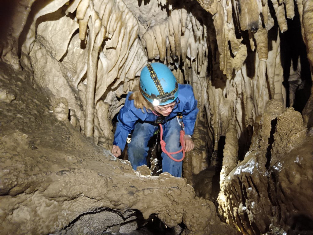 Une traversée d’initiation où le réseau supérieur sec et concrétionné mène par un rappel de corde au réseau inférieur. Là, coule un ruisseaux souterrain qui après de grosse pluie, peut mouiller jusqu’au genoux !